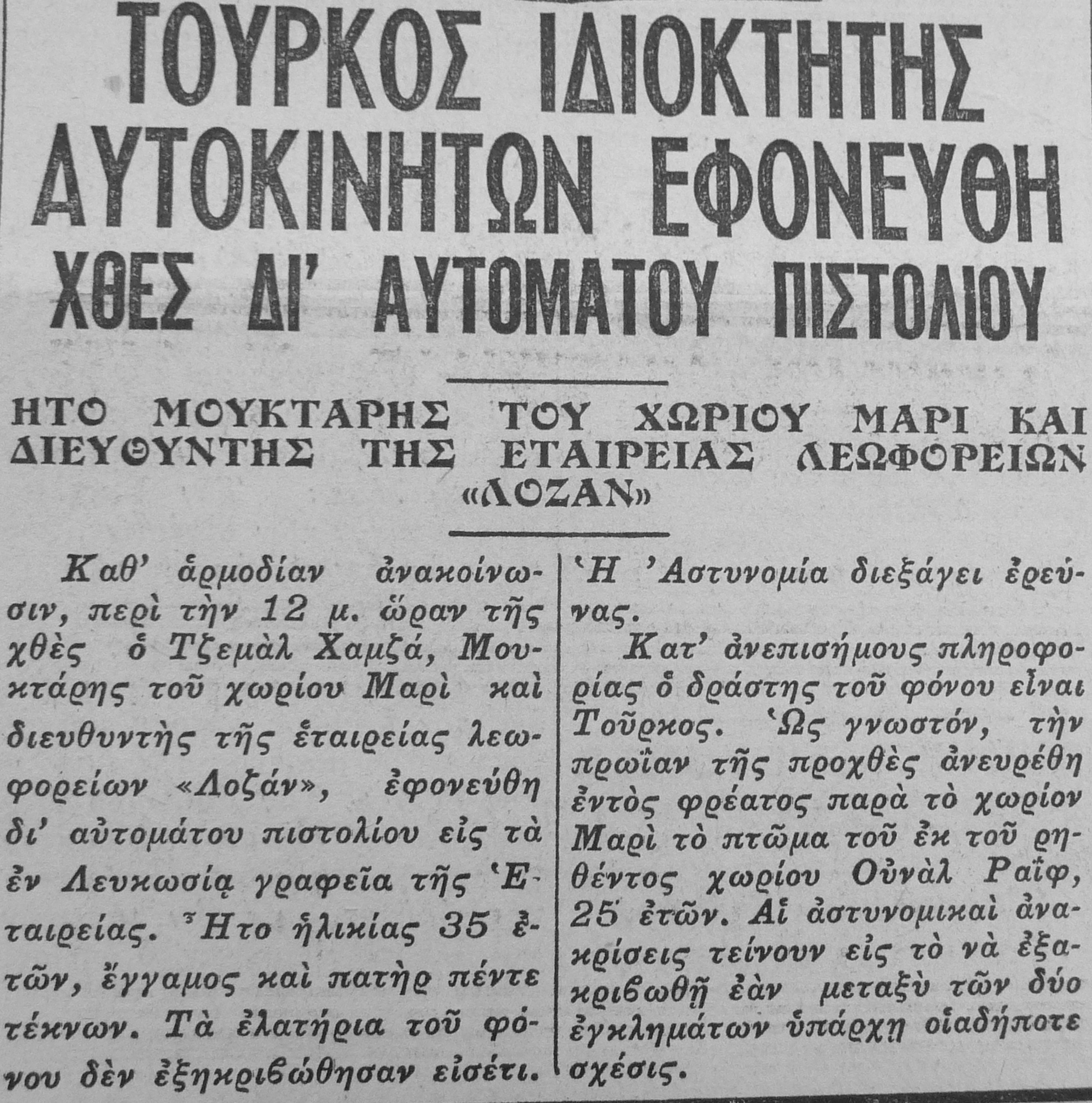 "ΤοÏρκος ιδιοκτήτας αυτοκινήτων εφονεÏθη χθες δι'αυτÏŒματου πιστολιοÏ", Eleftheria, 17 February 1961, p. 1