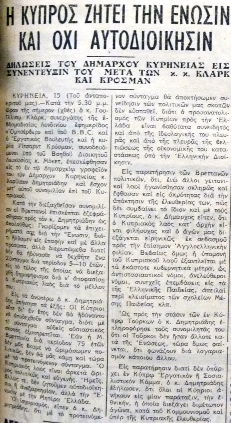 "Η ΚÏπρος ζητεί την Îνωσιν και ÏŒχι αυτοδιοίκησιν," Ελευθερία, 16 January 1955, p.1