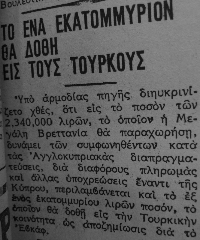 "Το Îνα εκατομμÏριο θα δοθή εις τους ΤοÏρκους", Eleftheria, 6 July 1960, p. 1