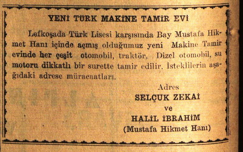 Yeni açılan Türk makinist dükkânı reklâmı.